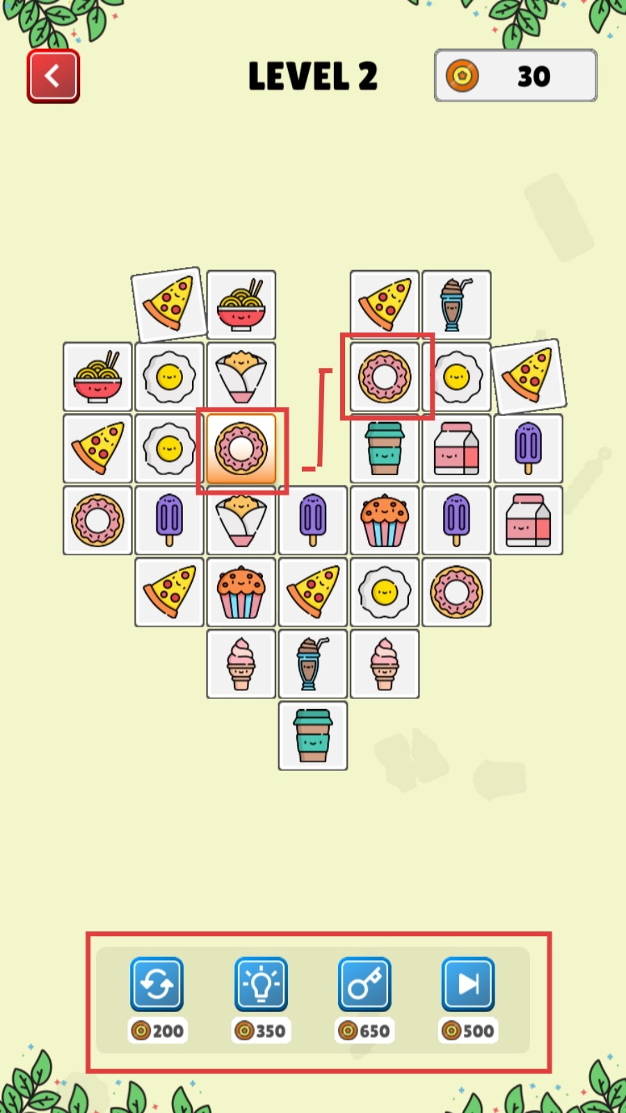 2、换成其他图案也是一样的逻辑,只要两个相同图案之间的连线不超过三条,就能成功消除,还可以借助下方的道具来帮忙哦。