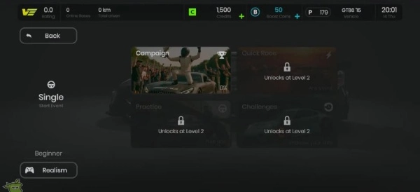 1、进入游戏后选择适合的赛事级别和赛车类型。