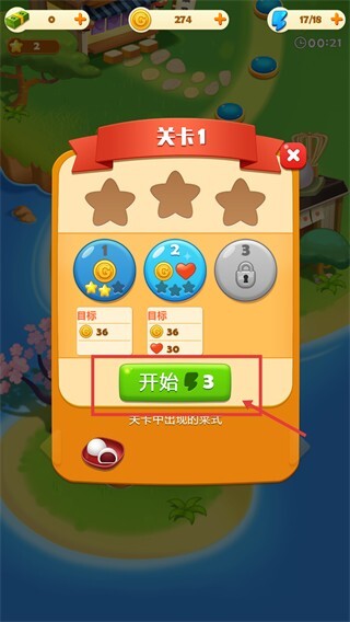 1、在关卡1的界面里,点击被框选的【开始】按钮,消耗3个道具就能开启关卡,需要完成的任务是收集【36】的金币和爱心。