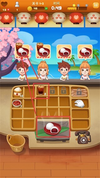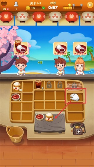 进入关卡1-2后,使用手套把食材制作成点心,以此来满足顾客的需求。