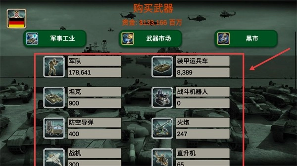 3、进入【购买武器】界面,能够查看当前军备的数量,若需补充装备,可通过【军事工业】-【武器市场】进行操作。