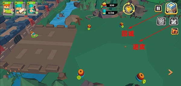 5、备战完成后,点击左侧的进攻按钮,若敌方火力过于猛烈,可选择回城展开防御。