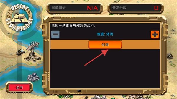 1、在关卡选择界面,点击【创建】按钮即可进入休闲难度关卡(任务目标:指挥正义方击败敌军)。