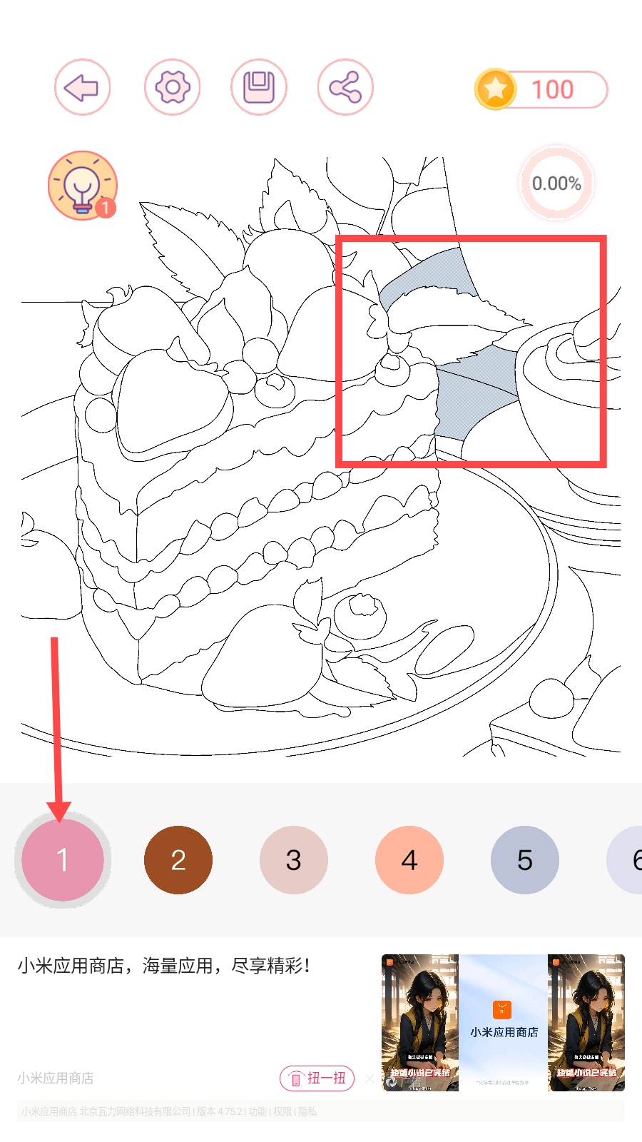 2、点击下方【1】按钮,即会出现需要涂色的区域。