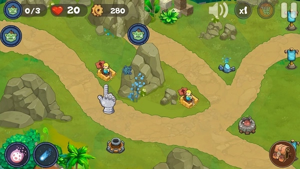 2、防御塔布置操作:点击地图上沉睡的“小人”位置即可建造塔防,初始建议从低消耗的基础塔(如弓箭塔)开始布局。