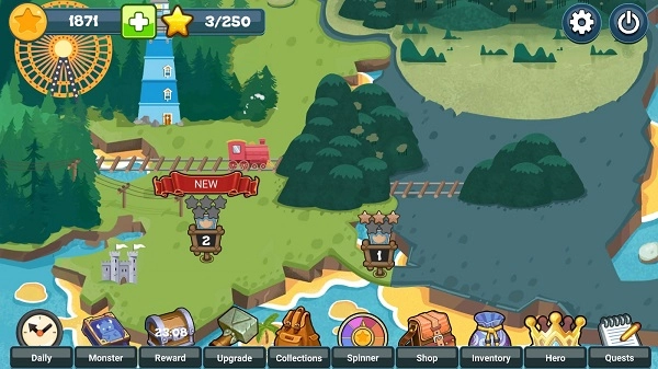 5、主界面底部设有多个功能入口,其中图鉴功能可帮助玩家详细了解塔防的升级属性与怪物特性,而通过装备技能或搭配英雄,则能够进一步增强塔防的防御能力,从而有效阻挡怪物的入侵。