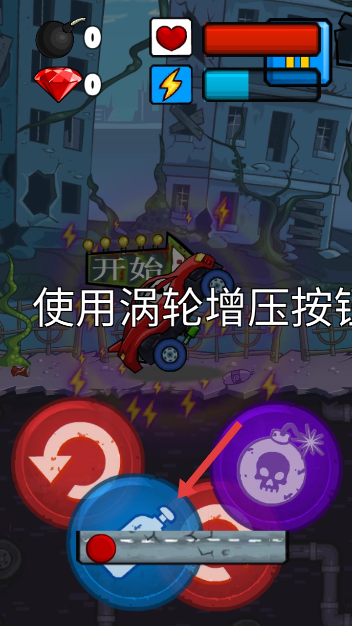游戏开始后,得点击下方的蓝色涡轮增压按钮,这样能助力我们的红色赛车迅速启动,以此来应对起始路段的挑战。