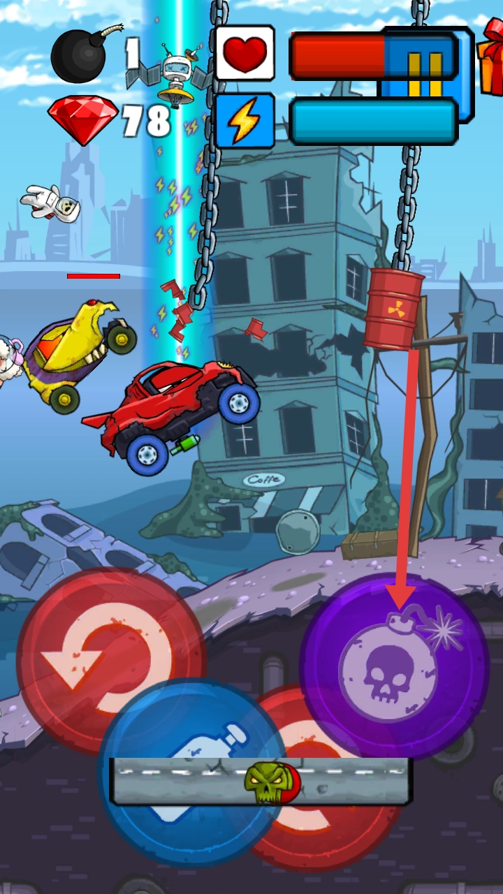 当遇到阻碍或是被其他选手干扰时,你可以点击紫色炸弹按钮,通过释放攻击来清除障碍,以便继续前进。