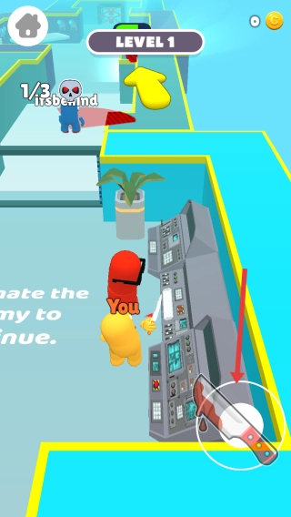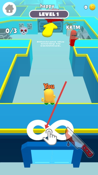进入LEVEL1关卡后,按照底部的提示来操控黄色角色移动,循着黄色箭头的指引,去靠近红色敌人。