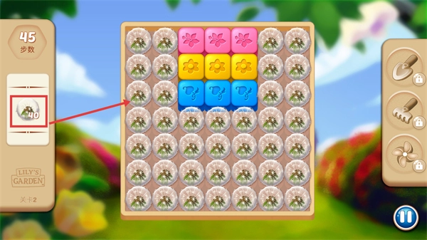 2、本关卡的核心目标是消除40个白色花苞,点击右侧即可完成消除操作。