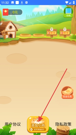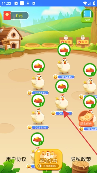 在主界面中,点击“添加小鸡”按钮,消耗相应资源后,养鸡场的小鸡数量就会增加。
