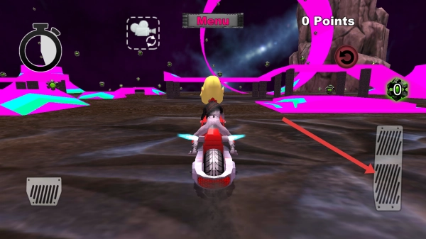 画面进入竞速环节后,通过右侧踏板可让摩托在红箭头指示的位置加速,左侧踏板用于刹车,需操控车辆在赛道内行驶,过程中要留意避开各类障碍。