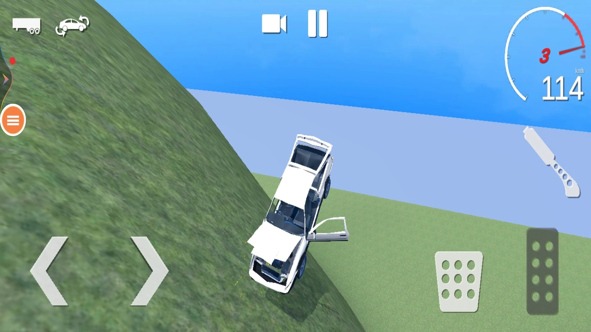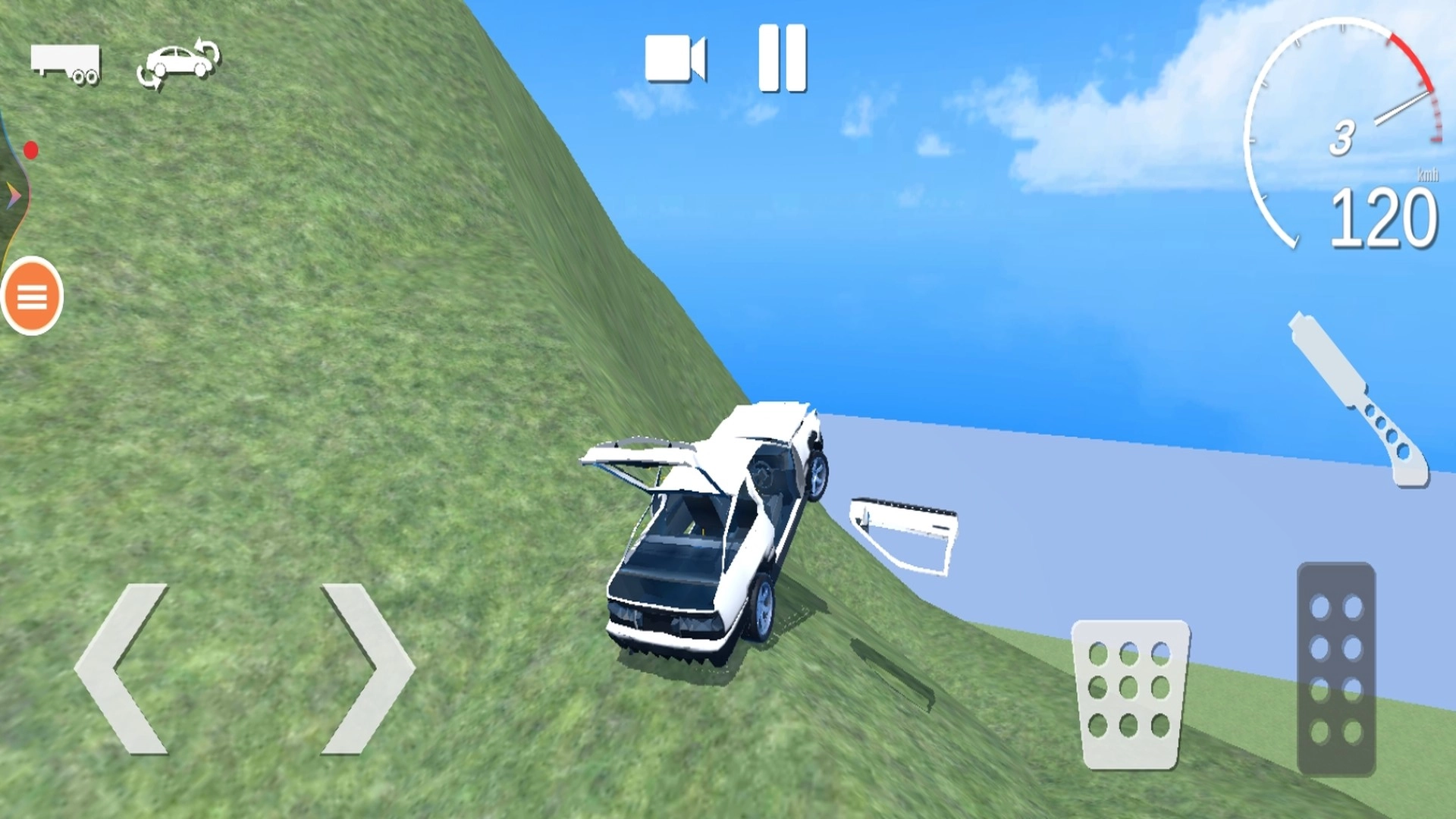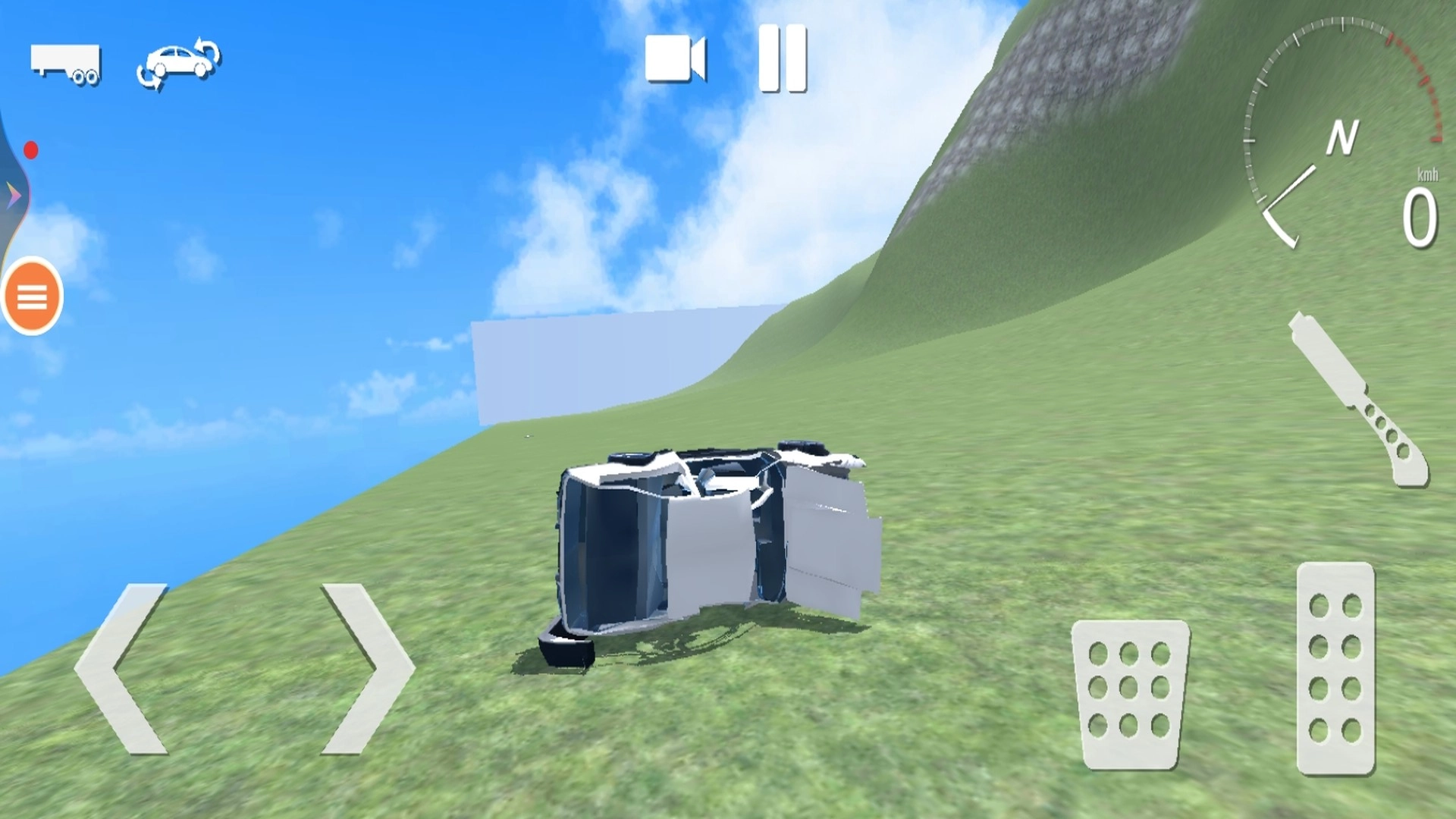 通过虚拟按键操控汽车的方向、油门与刹车,在特定场景中驾驶,冲越山坡、驶过弯道,达成碰撞相关的任务。