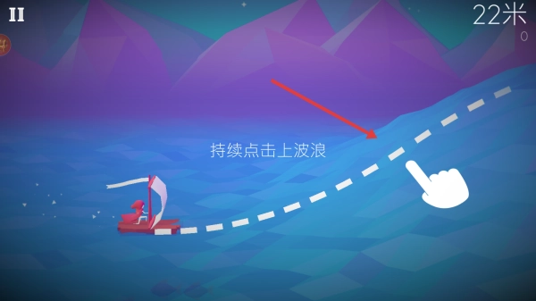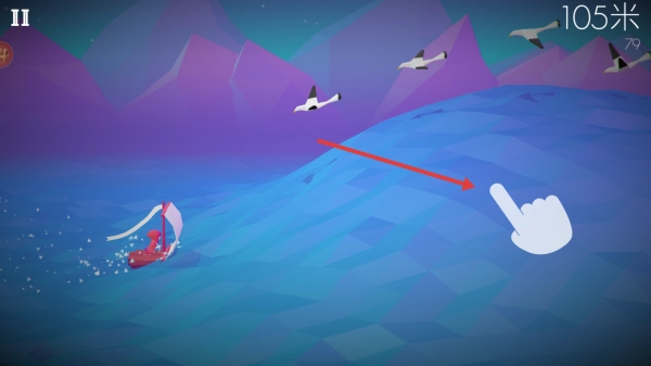航行过程中,按照箭头的指示点击海面,这样帆船就能借助波浪提升速度,同时要留意避开海鸥之类的海上物体。