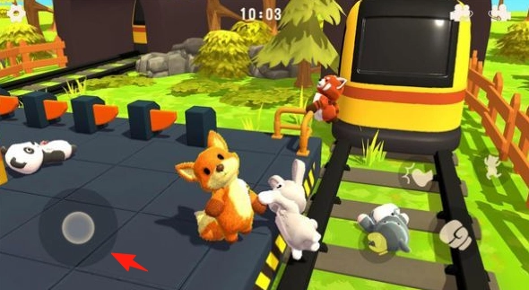 在卡通森林与火车站地图这类场景中开展互动,通过操控狐狸、兔子、考拉等动物,借助火车、围栏之类的场景道具来进行。