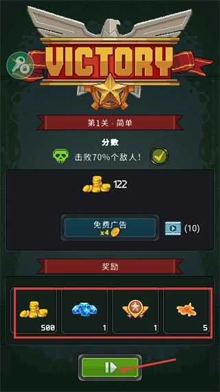 4、通过【第1关-简单】关卡后,能得到【500】金币、【1】钻石之类的奖励,点击按钮就可以进入下一关接着挑战。