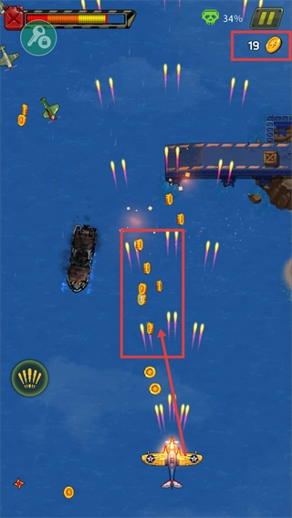 在战斗进行时,收集场景里的金币,金币数量会即时更新,积攒的金币能够用来给后续的战机升级或者解锁科技。