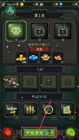 1、在【第1关】界面,消耗【5】个道具并点击【开始游戏】按钮即可进入关卡,也可以先查看【先进科技】模块来提升战机的能力。