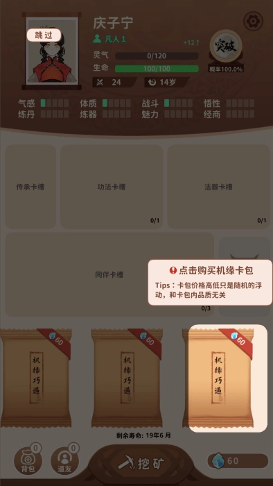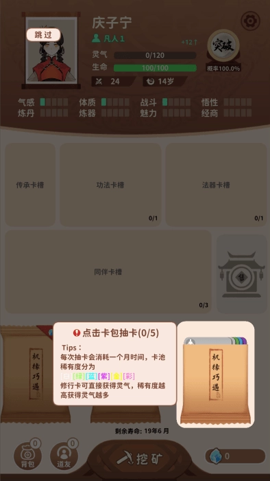 卡包修仙游戏为你带来修仙题材的拆卡包乐趣,在这里你可以挖矿、兑换卡包,然后无限拆卡包,卡包类型丰富多样,能获得功法、人物和修炼资源,助力自己不断突破,期间还需要参与战斗,快来一起体验吧!