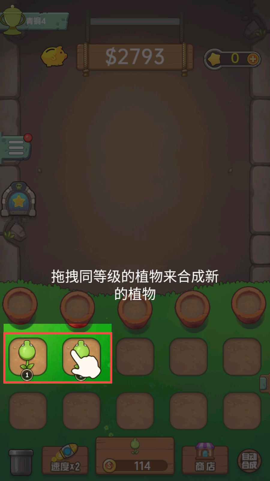 把两株等级相同的植物拖到一起合并,就能合成更高级的植物,这样可以增强攻击能力来对抗丧尸。
