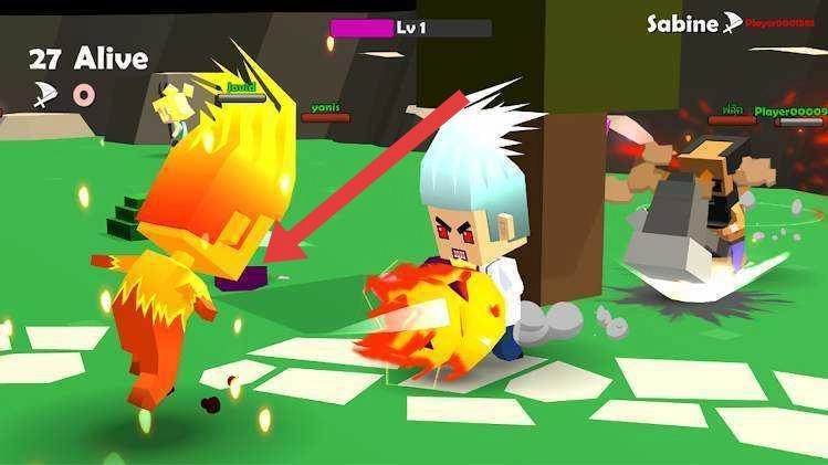 战斗时,操控带有箭头指向的火焰角色,攻击敌方角色(例如那位白发对手),借助技能与武器,将敌人淘汰。