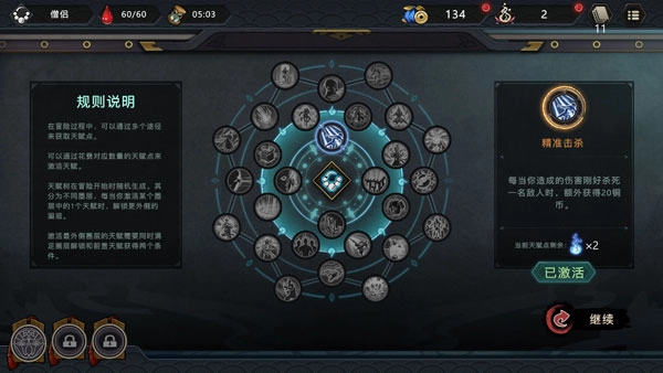每局游戏的天赋盘由一半随机职业天赋和一半通用天赋构成,僧侣对天赋的需求不算高。游戏开始前,刷出通用天赋“精准击杀”就行,这个天赋对四个职业都挺重要,能让你实现无限出牌的操作。不过仍有几个职业天赋对通关帮助很大,这里简单给大家介绍一下,要是遇到的话尽量点一下。