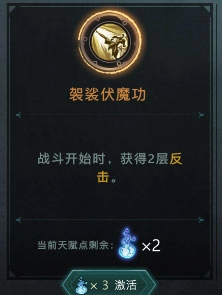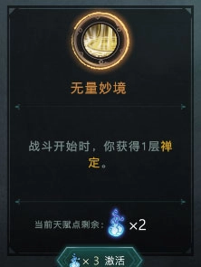 天赋方面,“横扫八方”的效果是:当触发先制时,会对其余敌人同时造成3点伤害;“专注先制”的效果为:回合开始时,若自身未拥有先制,则获得3层先制;“武运在天”的效果是:在一场战斗里,首次触发先制时,抽取两张牌。