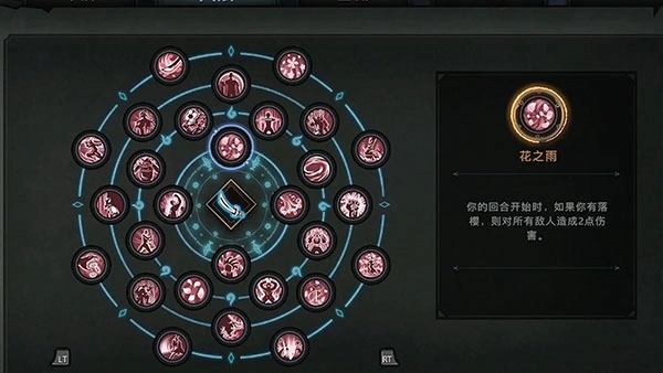 天赋中可携带“赏樱达人”,能使樱花牌效果提升50%;“花尽散”触发落樱时可获得4点力量;“轰华绚烂”樱花牌的行动力花费永久为0点;“意境”则是在你获得额外行动力时会获得一层落樱。