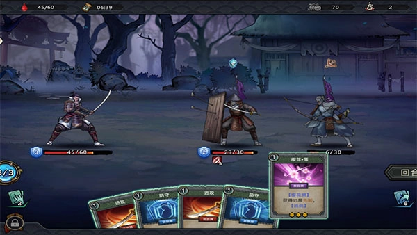 【落樱】的效果是:当武士身上叠加的带有落樱状态的卡牌层数达到5层时,就能获得1个行动点数,同时会有一张随机的樱花牌被置入手牌。樱花牌通常具有十分强力的效果,比如樱花·袭能造成15点伤害,樱花·御可获得10点护甲值,樱花·落则能获得15层先制。