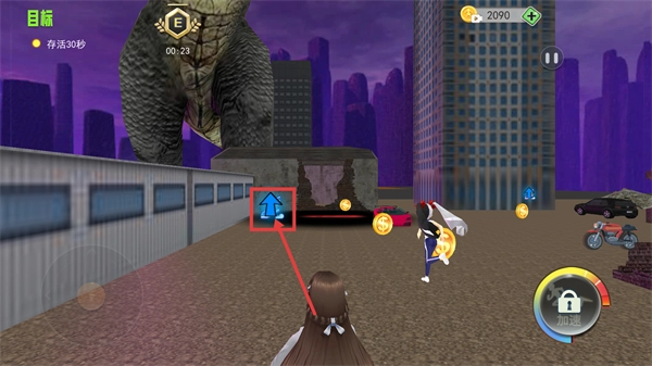 2、按照【蓝色向上箭头】的提示移动,在躲避巨人追击的过程中收集金币,目前剩余的存活倒计时是【00:23】。