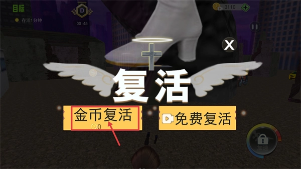 4、要是被击败了,可以选择【金币复活】或者【免费复活】,这样就能快速回到关卡里,继续去完成生存目标。