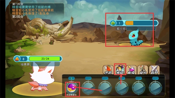 3、对战过程中,当敌方的【蓝小毛】生命值处于较低状态时,选择【捕捉】功能选项,并且使用【高级精灵球】,能够提升捕获它的成功率。