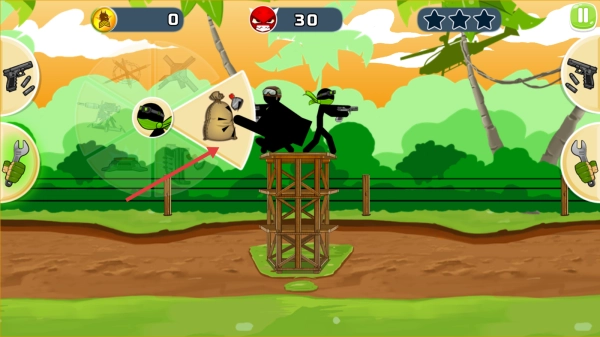 第1关场景中,你需要操控火柴人小队登上木塔,按照指引选择钱袋道具并搭配武器,瞄准下方的敌人,借助地形优势发起攻击以推进关卡。