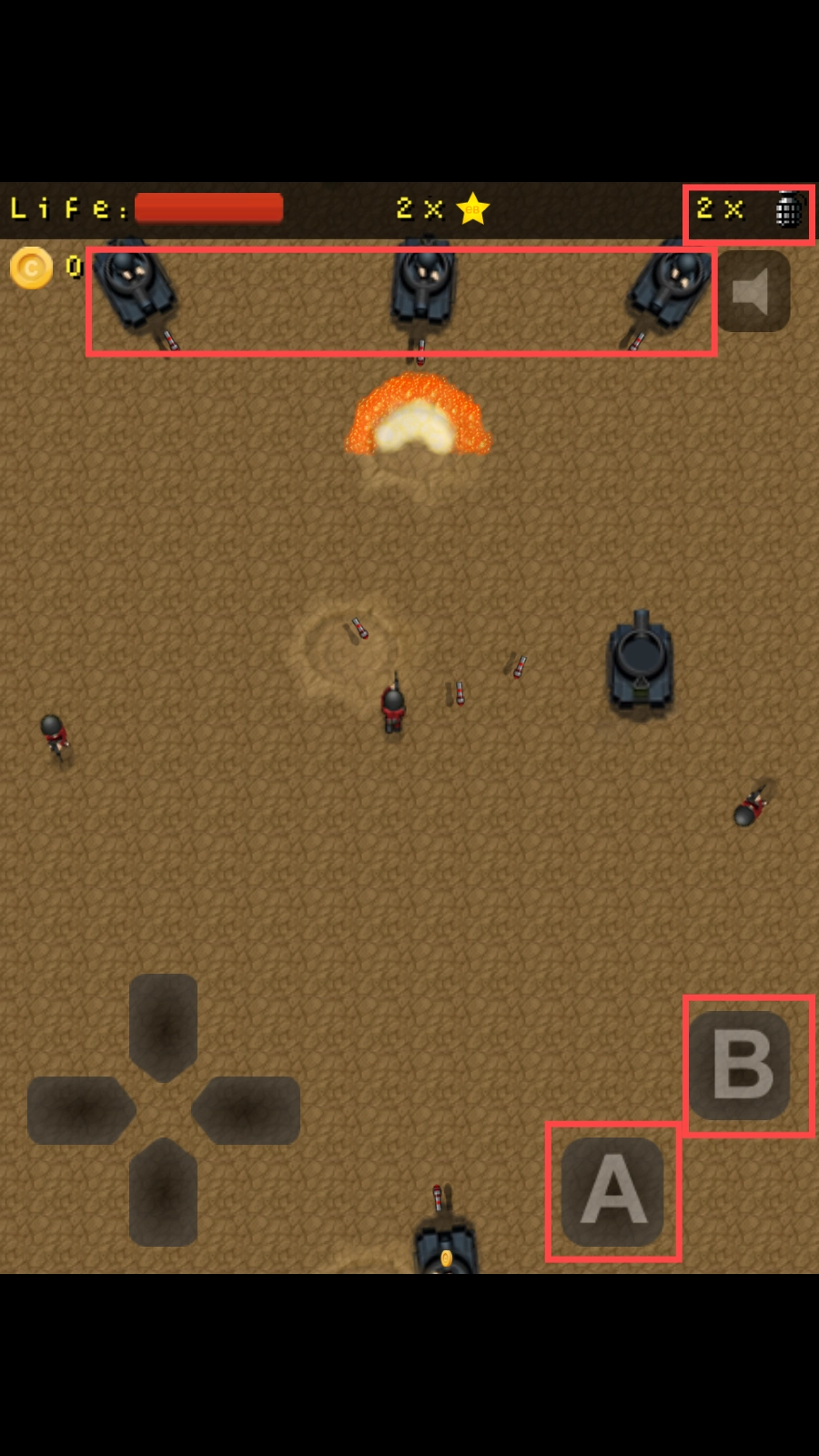 面对敌军坦克,我们按下【A】、【B】键就能发射子弹和投掷榴弹,对敌人实施精准打击。