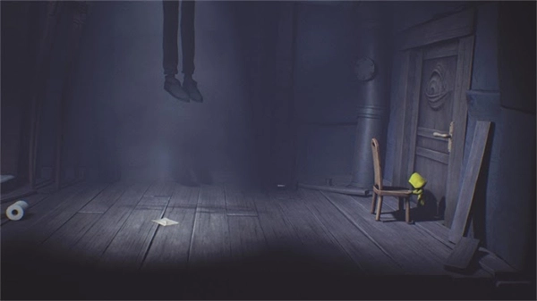 在这个房间里,你会看到一个男人的脚悬在空椅子上方。把椅子拖到门口,爬上去借助它垫高身体,然后跳起来抓住门把手将门打开,进入下一个房间。