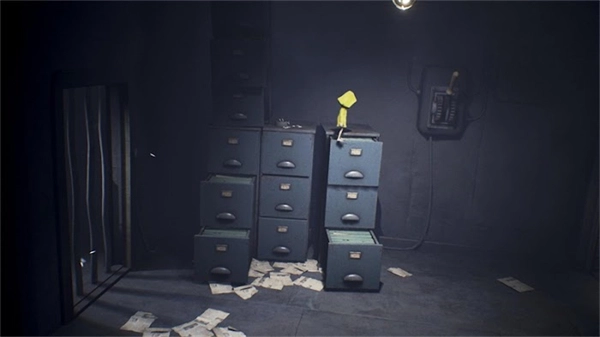 到隔壁房间,你会看到另一个开关。先去房间左侧办公室的抽屉那里,拉开最底下那层抽屉。踩上去后,把第二层抽屉拉出一半。接着继续往上爬,再向上并侧身移动到橱柜顶端。最后跳起来抓住那个开关,就能切断电源了。