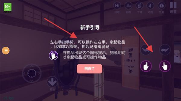 2、首先会开始一个新手引导,左右手指可以操纵左右手拿物品等。