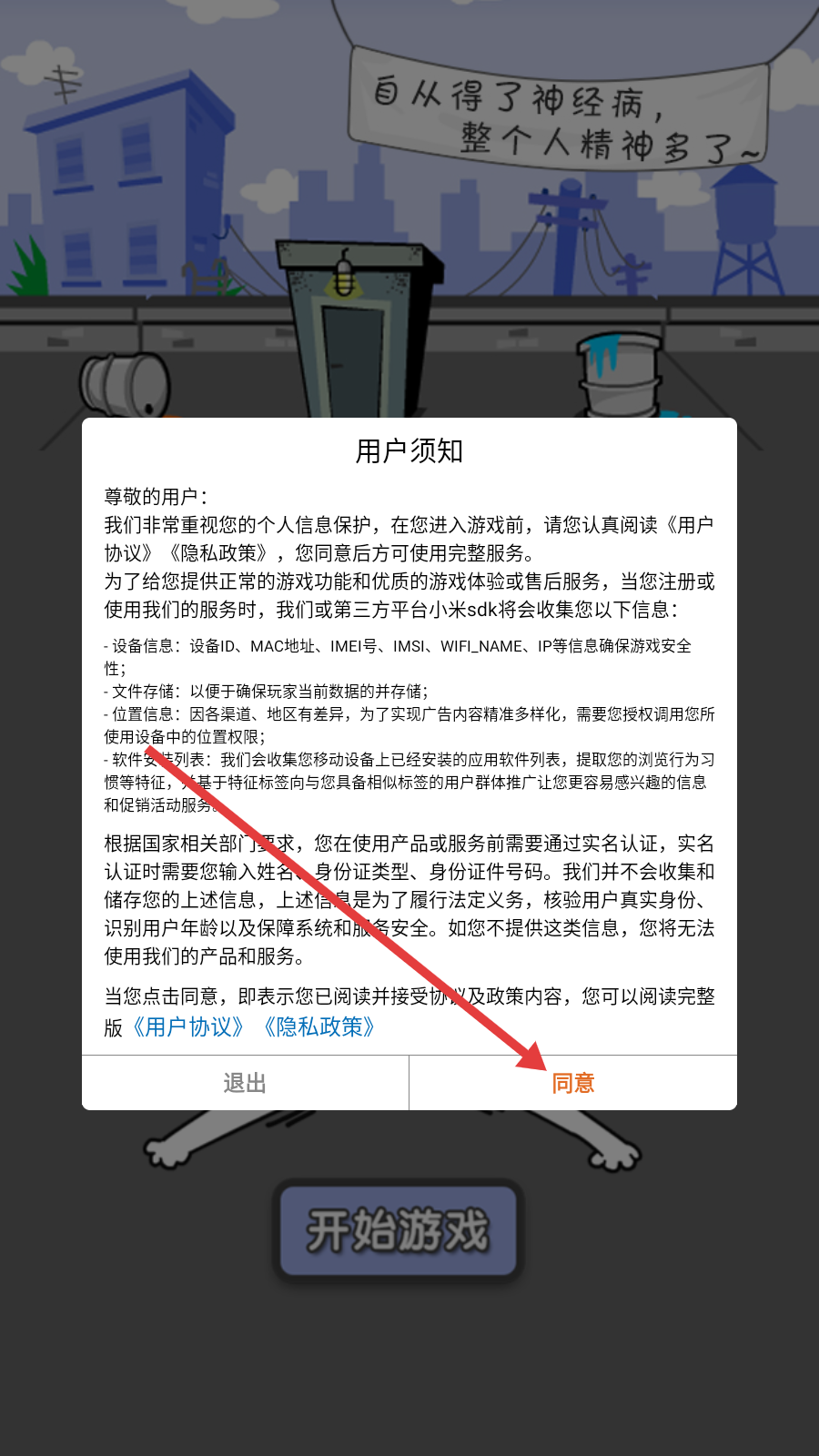 1、进入游戏,点击【同意】。