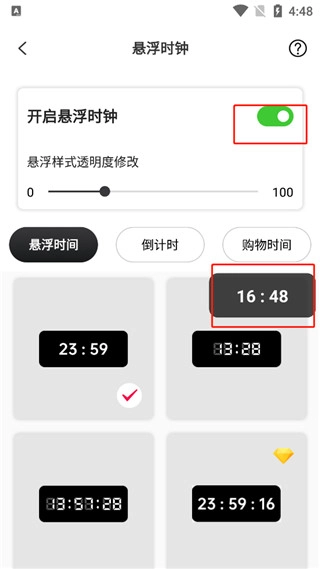 3、点击悬浮时钟,再点击开启键,就能打开悬浮时间功能,此外还有秒表时钟可供选择。