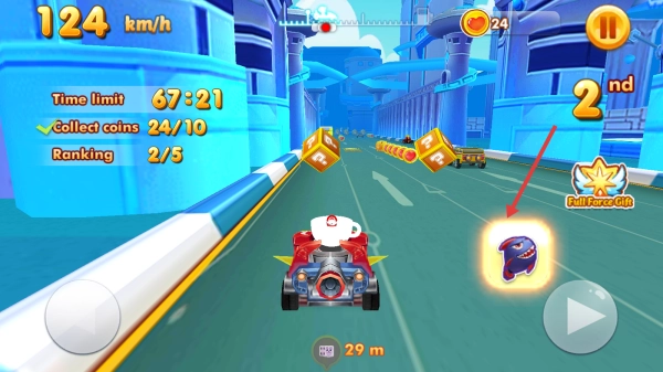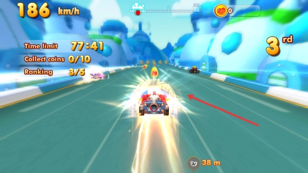 赛道上操控赛车(排名第三),拾取加速道具,超越粉色与黑色的对手,同时收集沿途金币。