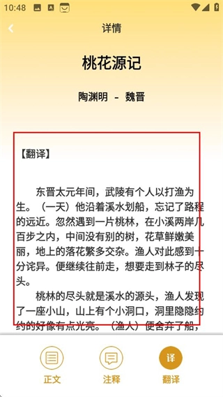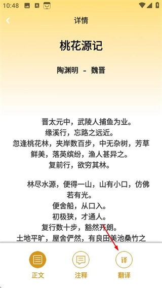 3、进入详情页面后,点击翻译选项,即可查看《桃花源记》的翻译内容。
