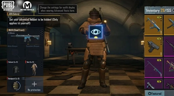 另外,今后各位特种兵要是想显示或者隐藏头盔和背囊的模型外观,直接在Metro Royale大厅打开战备功能,点击左上角的小眼睛按钮就能调整相关设定。不用再切换回经典大厅,操作起来会更方便!