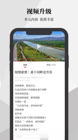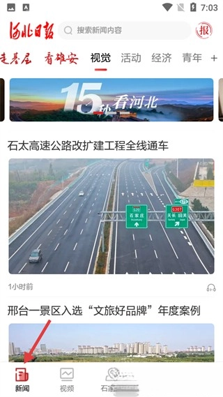 1.新闻板块设有走基层、看雄安等频道,呈现石太高速公路改扩建通车、邢台景区入选文旅案例等资讯,提供新闻内容搜索功能。
