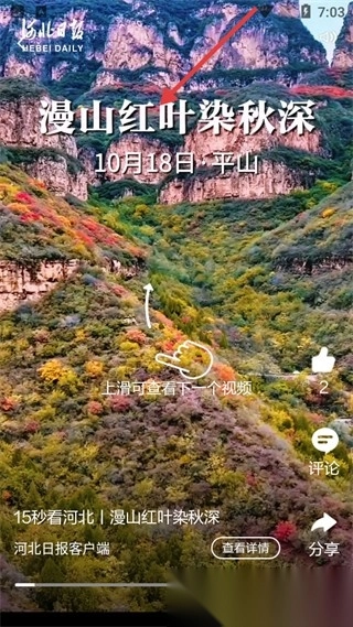 2.视频板块以平山漫山红叶的内容为主,用户能通过上滑切换至下一个视频,同时支持点赞、评论、分享操作,还设有查看详情的功能入口。