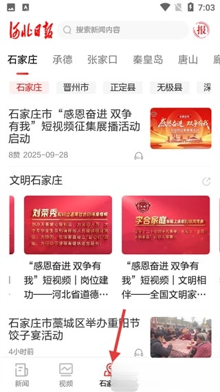3.石家庄板块,涵盖石家庄、承德等地,呈现石家庄市短视频征集活动、文明石家庄案例、藁城区重阳节活动等本地信息。