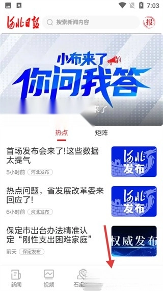 4.河北发布板块设有热点、矩阵分类,呈现首场发布会数据、省发改委对热点问题的回应、保定市刚性支出困难家庭认定办法等政务信息。