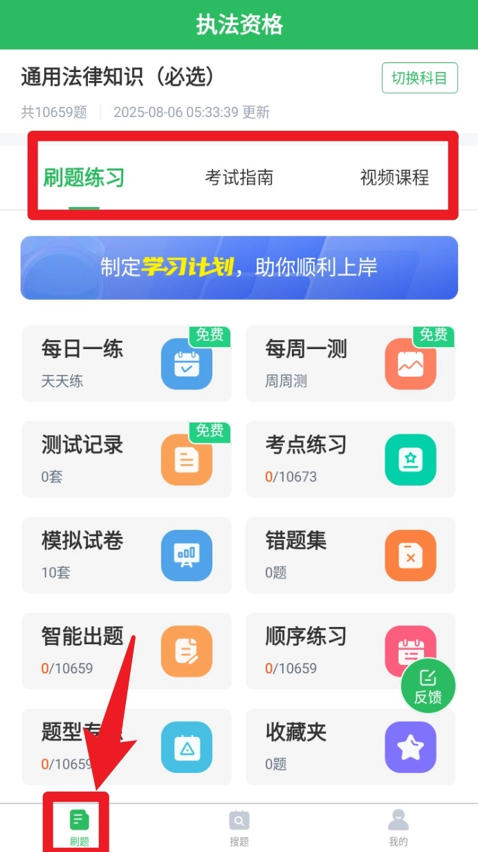 1. 进入首页后点击底部的刷题按钮,即可看到每日一练、考点练习、模拟试卷等不同模块,大家可以根据自己的需求自由选择适合的练题方式。