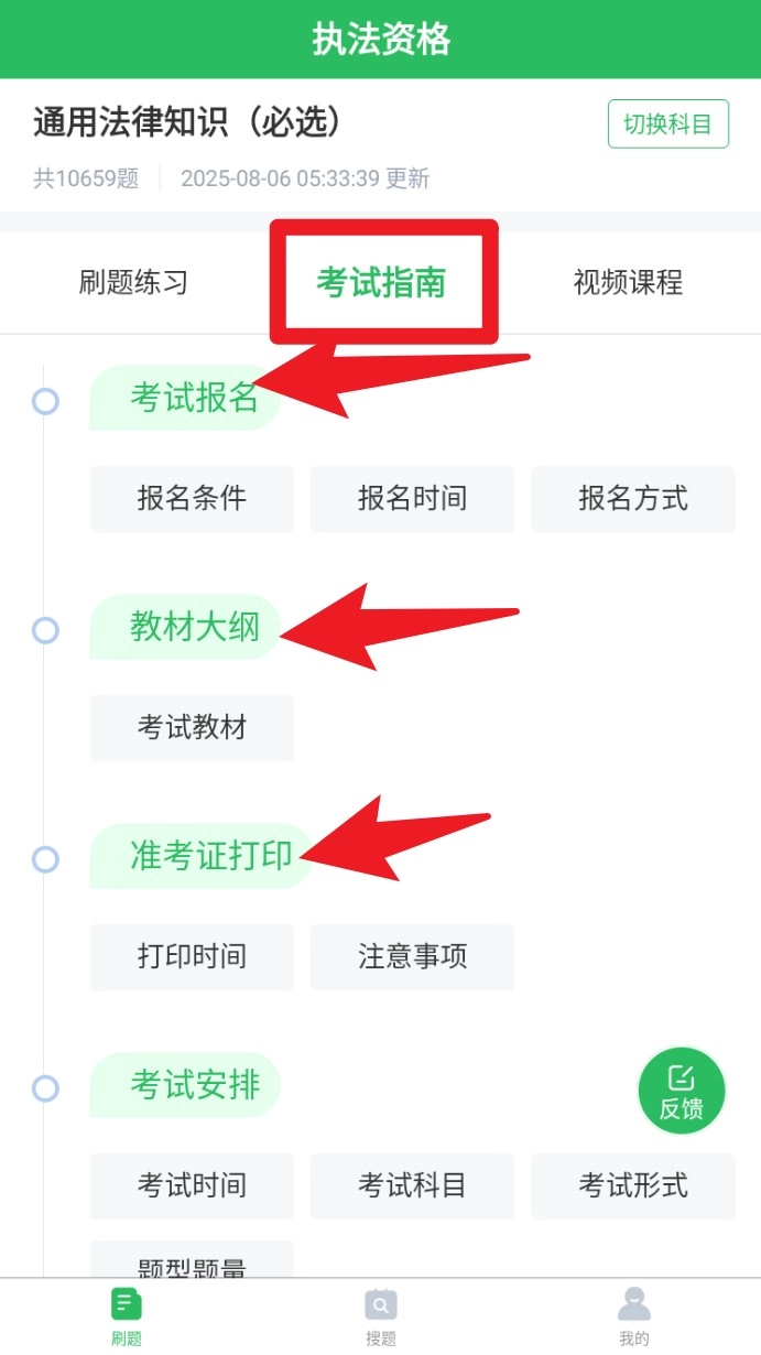 2. 切换到考试指南页签,查看考试报名、教材大纲、准考证打印等相关信息,以便快速熟悉考试流程。
