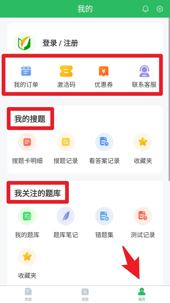 4. 进入个人中心页面,能够管理订单、激活码以及联系客服,还可以查看自己的题库、错题集和搜题记录。