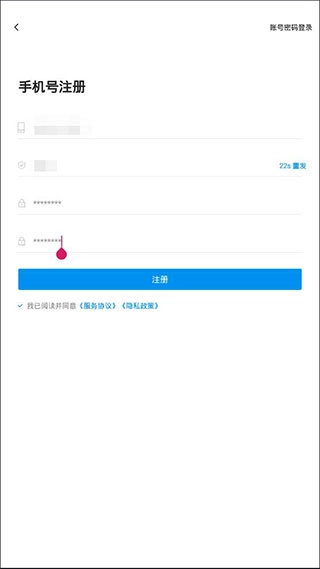 2、接下来我们要输入正确的手机号码、验证码,设置密码并进行二次确认,之后点击【注册】按钮。